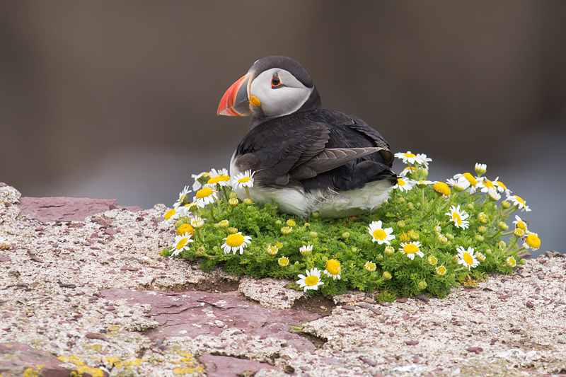 Puffins can be found all around the island; usually by their burrows along the tops of the cliff. This one was near the quay. ![]()
