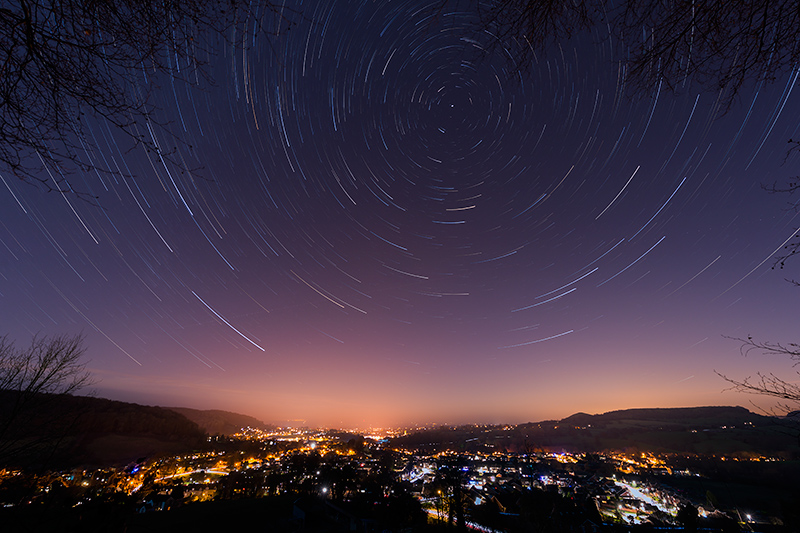Two pictures of star trails over Dursley, both derived from the same set of 34 exposures of 2 minutes each. The first is with a constant exposure throughout and the second is with an increase of 0.05EV from one exposure to the next; both reaching the same final exposure. ![]()