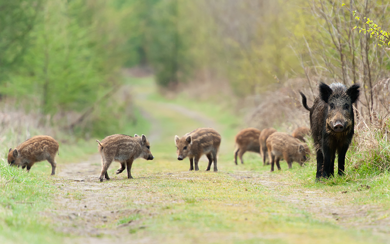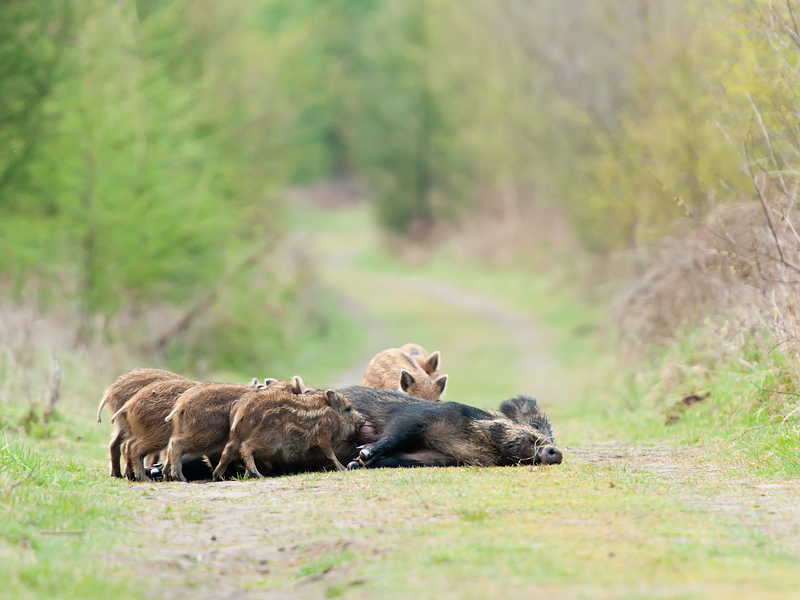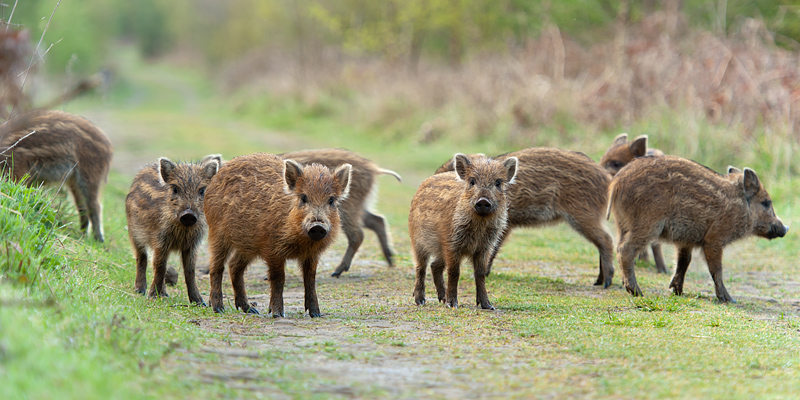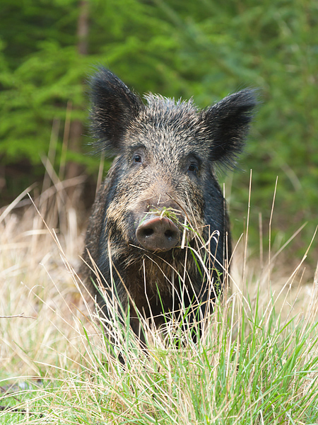 Forest of Dean, April 2012 Just back from a week's family holiday in the Forest of Dean. Weather was far from perfect and spent most of my time photographing birds in the cottage garden, but one drizzly evening we did find a family group of wild boar: two adults and eight young. They had crossed the path in front of us, so we headed for the next parallel track and found the sow rooting and the youngsters running around. They were heading in our direction. Ignoring the misleading official advice about encounters with wild boar, I approached them, low, along the side of the track and then sat down, kept still and waited. None was worried by my presence. The sow approached to within 4 metres before backing off slowly and calmly. Unfortunately, there was no direct sunlight, and the poor light meant I had to push the camera speed to ISO 800 or 1600. We saw the actual boar later on from a distance; he simply grunted and went off to join his family. The boar receive a bad press. My experience is that they are no danger if you are calm and peaceful. From what I read, the boar are only dangerous if you threaten or corner them. You can find more information about these beautiful animals at www.friendsoftheboar.blogspot.co.uk. ![]()