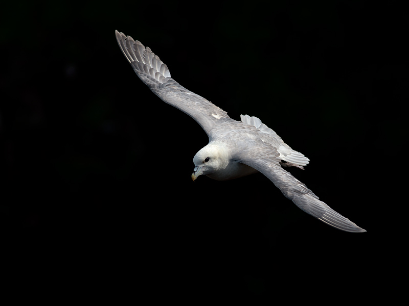 There are also plenty of gulls and fulmars. This fulmar was passing a dark cliff in shadow so the background came out completely black. ![]()