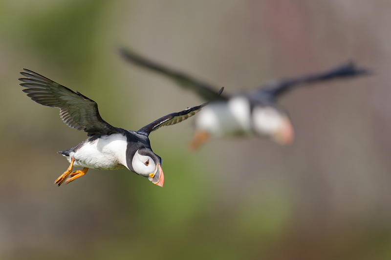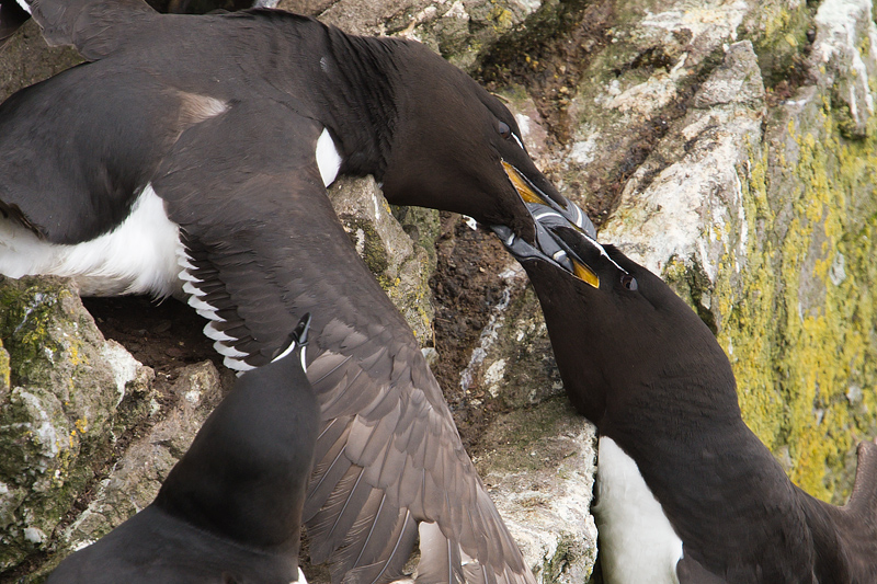 The cliffs around the island are home to guillemots and razorbills. These two were involved in a fight, which ended when one was forced over the edge. He dropped but managed to right himself before landing safely much further down. ![]()