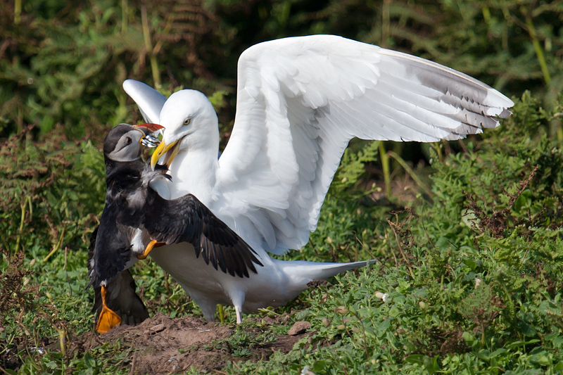 Puffins are often the victims. Here, a herring gull is "persuading" a puffin to give up its catch... ![]()