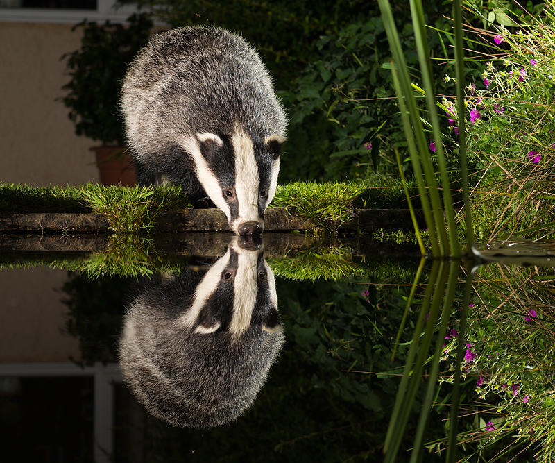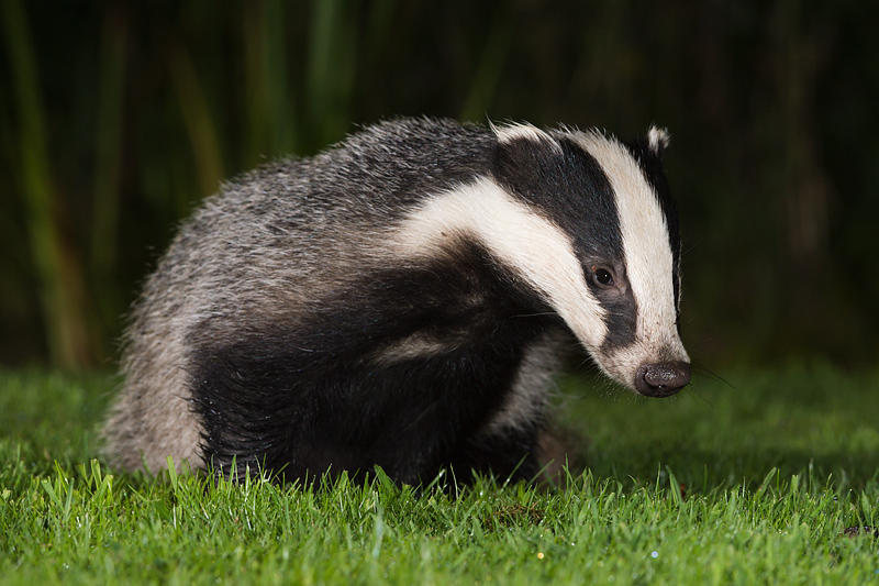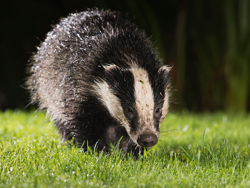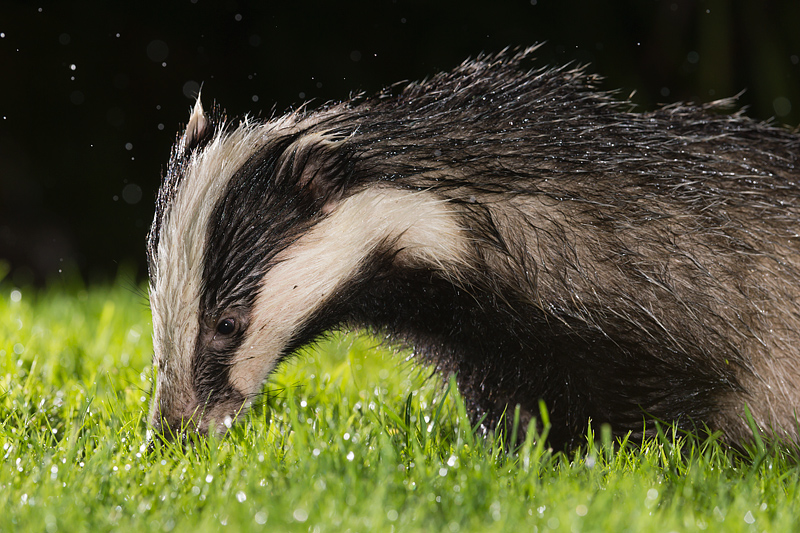 Badgers in Dursley, August/September 2012 I have turned my attention to some local badgers. Unfortunately, these live very close to Dursley and it is rare to see them out in daylight. Hence, it has been necessary to use artificial light. One of this year's cubs, in particular, is now used to flashes and so it is possible to get some good shots as he comes to feed. A continuous bright light is also needed to aid focusing in the dark. The penultimate picture was taken in pouring rain - the rain drops look like stars in the sky! ![]()