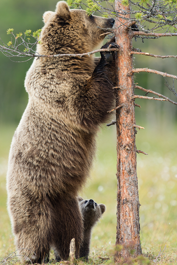 Cub watches as mother reaches up into a tree. ![]()