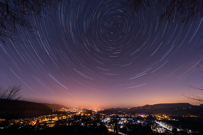 Two pictures of star trails over Dursley, both derived from the same set of 34 exposures of 2 minutes each. The first is with a constant exposure throughout and the second is with an increase of 0.05EV from one exposure to the next; both reaching the same final exposure. ![]()