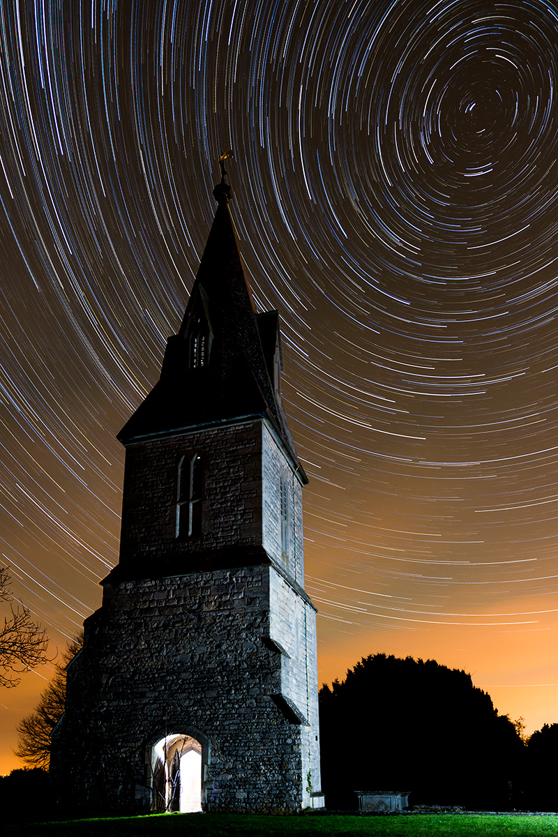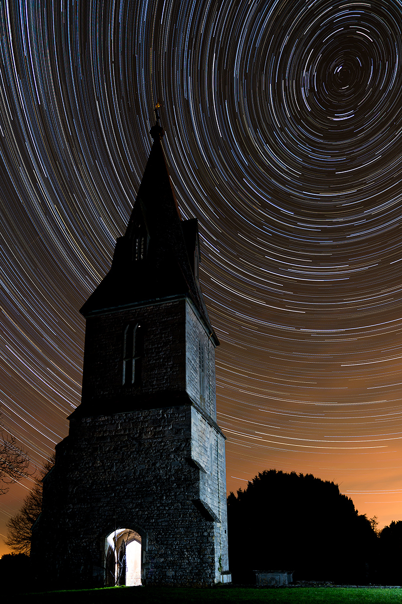 Star Trails, Gloucestershire, December/January 2014/15 Two pictures of star trails over Frocester Church, both derived from the same set of 62 exposures of 2 minutes each. The first is with a constant exposure throughout and the second is with an increase of 0.03EV from one exposure to the next; both reaching the same final exposure. There were two final exposures, one with lighting applied to the outside of the spire and one to the inside. ![]()