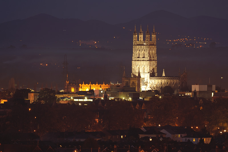 Gloucester Cathedral viewed at night from Robinswood Hill