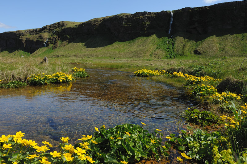 Marsh marigolds near the Seljalandsfoss waterfall