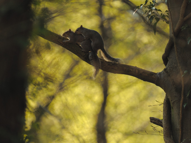 Grey squirrels mating, Cockshoot Wood, Stinchcombe Hill, Dursley, Gloucestershire