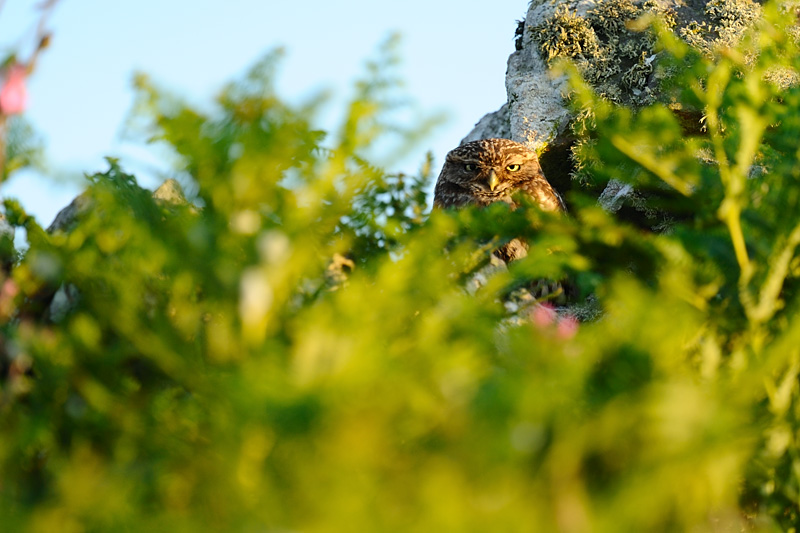 Little owl on stone wall, Skomer Island, Pembrokeshire