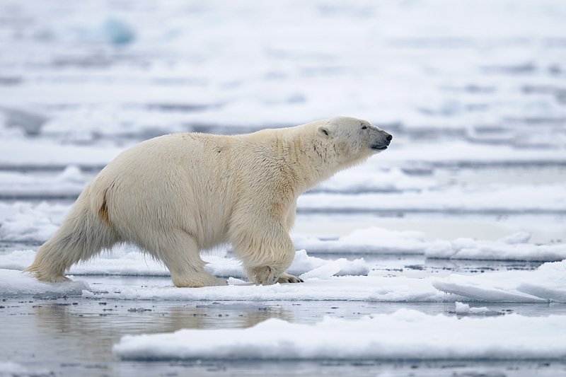 Polar bear crossing ice floes, northeast of Phippsøya, Nordaustlandet