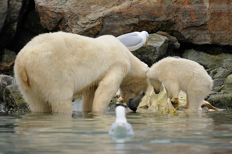 Polar bear and cub by whale carcass, Sallyhamna, Spitsbergen