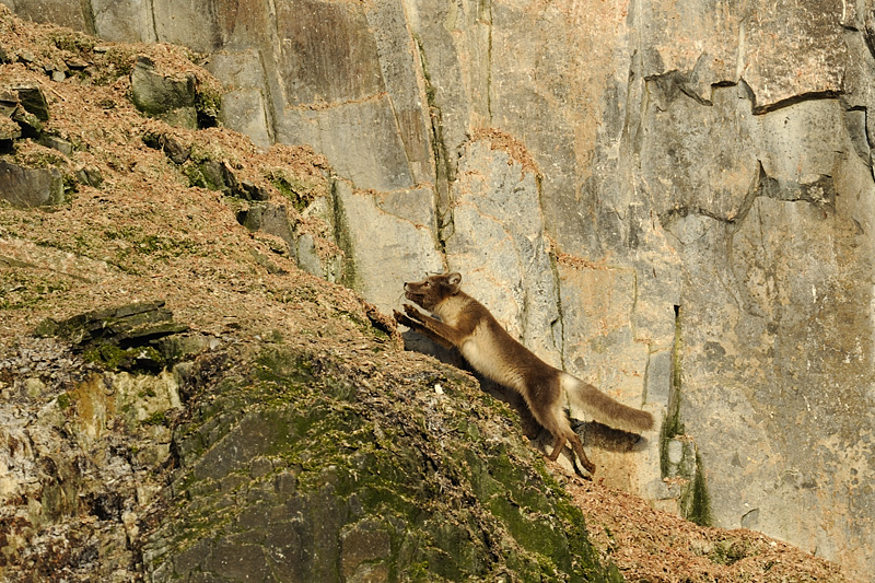 Arctic fox running up the cliff at Alkefjellet, Spitsbergen