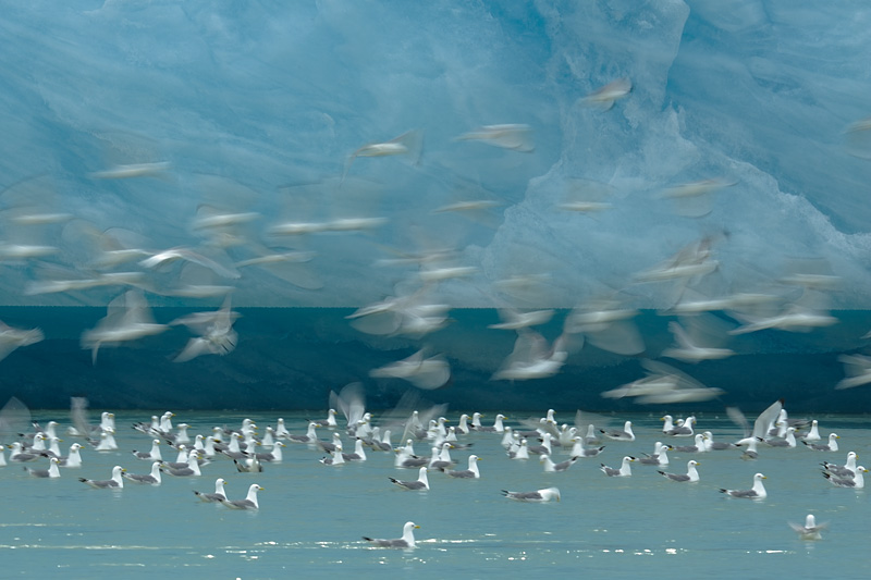 Kittiwakes feeding on upwellings by the front of the Monocobreen glacier, Spitsbergen