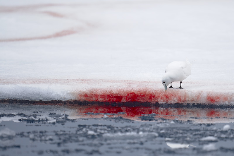 Ivory gull by site of seal kill on drift ice, northeast of Phippsøya, Nordauslandet
